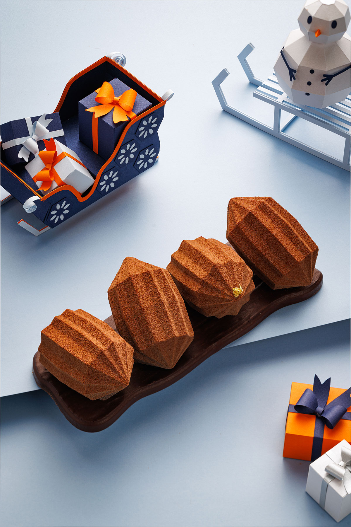 カカオポッドを幾何学デザインで表現したスタイリッシュな一品。中にはショコラのムースとクリーム、ビスキュイショコラやキャラメルクリームが詰まっており、土台に用いたヘーゼルナッツのプラリネ、キャラメリゼしたヘーゼルナッツ、キャラメルを挟んだショコラなどが多彩な味わいと食感を演出する。濃厚なショコラとキャラメル、ナッツの香ばしさが重なり合い、カカオの魅力を存分に堪能できる。