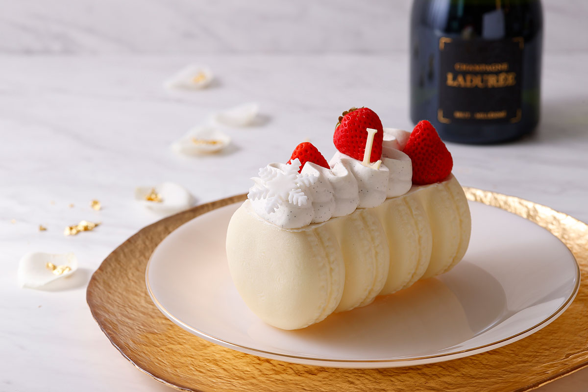 マカロンが4つ連なっているかのような遊び心あふれるラデュレのビュッシュ・ド・ノエルに、いちごのショートケーキが登場。ジェノワーズ⽣地にバニラが⾹るガナッシュ・モンテ、いちごのクーリを重ね、ホワイトチョコレートで包み込んだ。そこに、たっぷりのガナッシュ・モンテと雪の結晶、L字のホワイトチョコレート、フレッシュのいちごをデコレーション。ラデュレ流のいちごショートを味わって。