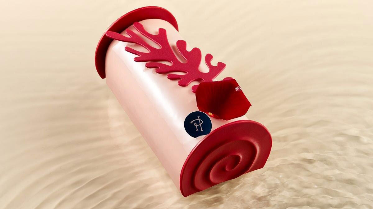 ピエール・エルメ・パリを代表する「イスパハン」がビュッシュ・ド・ノエルになって登場。バラの華やかな香りとライチのみずみずしい風味、そこにフランボワーズの酸味が重なり、上品でフルーティな味わいが広がる。今年は、環境活動家でもあるアーティストのコートニー・マティソンとコラボレーションし、珊瑚礁をモチーフにしたチョコレートをあしらった特別なデザインが完成。