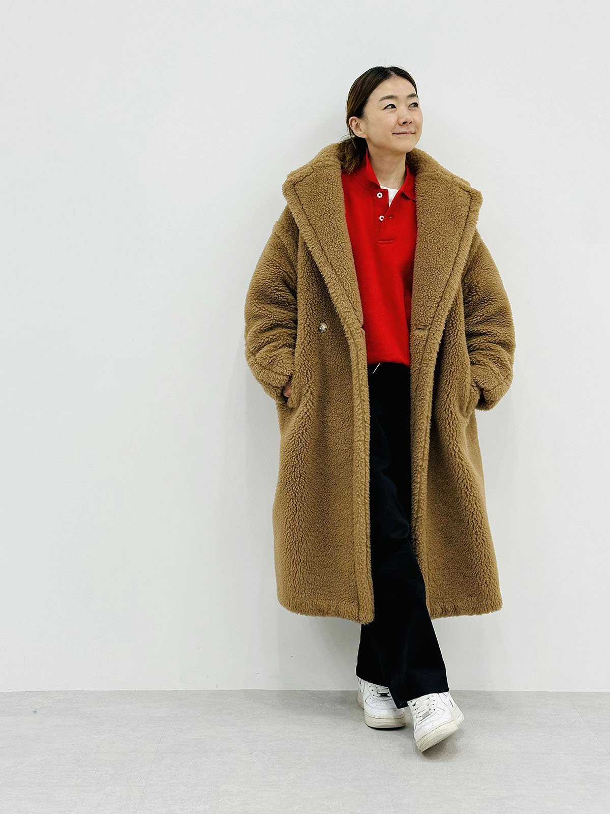 「今年2月、ミラノで購入したキャメルの『テディベア コート』。実は赤、黒に続いてこれで3着目ですが、どのカラーもどんなスタイリングにも合わせやすく、デザインもタイムレスで長く付き合える一着です。仕事からプライベートまで、シーンを選ばず活躍してくれます。防寒性も高く、白Tの上にさっと羽織るだけでしっかり暖かいのに、とにかく軽くて肩が凝らない。華やかさと実用性を兼ね備えた、冬の装いをやさしく守ってくれるボディーガードのような存在です」