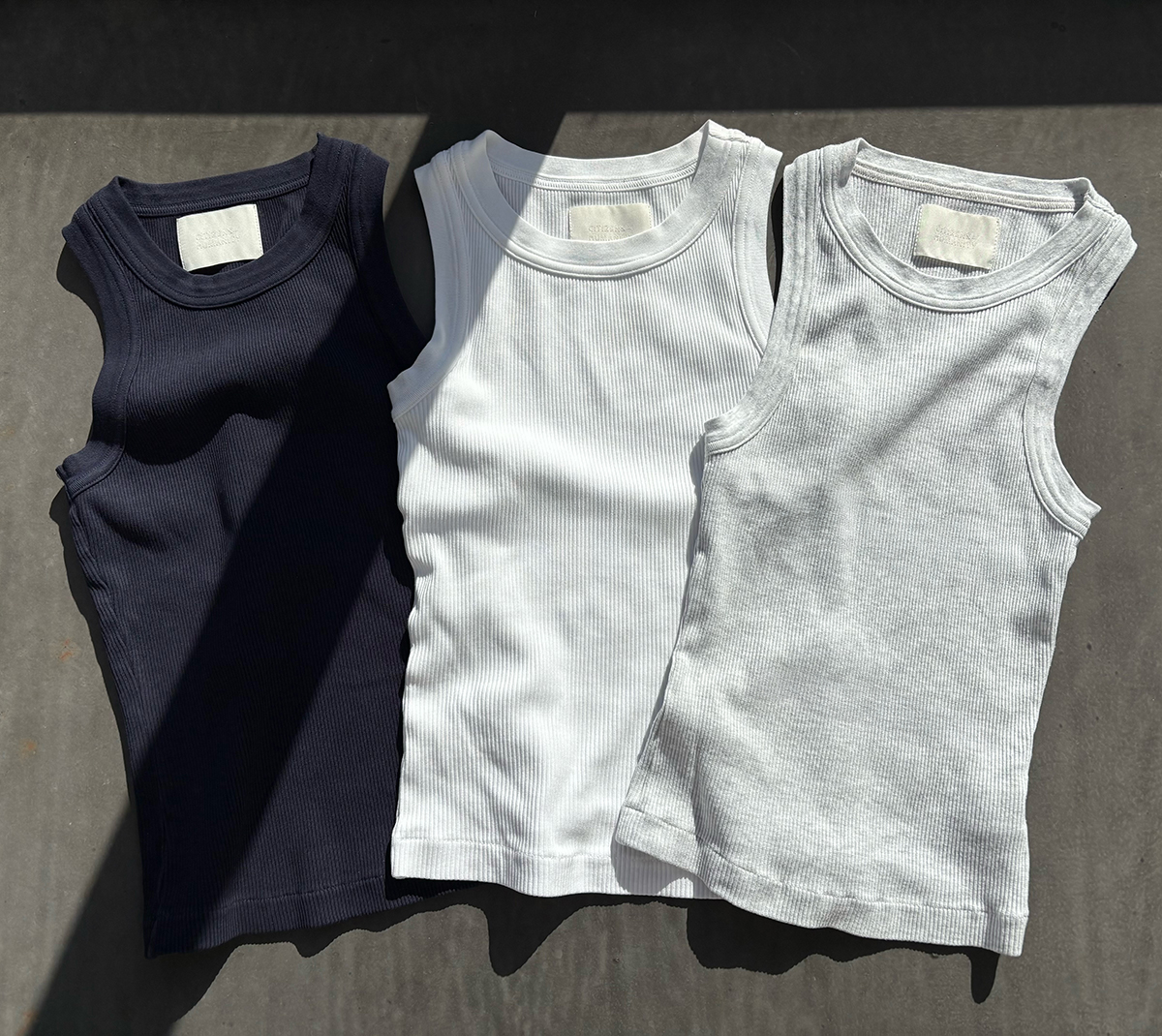 「四季の中でいちばん好きなのは夏。夏の定番といえば白Tシャツですが、私のユニフォームは断然タンクトップです。ここ数年の異常な暑さに、Tシャツすら無理…と感じて、生地面積の少ないものをと求めた結果たどり着きました。昨年出合った『シチズンズ・オブ・ヒューマニティ』のタンクトップがとにかく優秀で、今年はさらにカラーを追加。柔らかな肌触りと程よい厚みで、一枚でもインナーでも活躍してくれます。どんなスタイルにも合わせやすい頼りになる相棒です!」