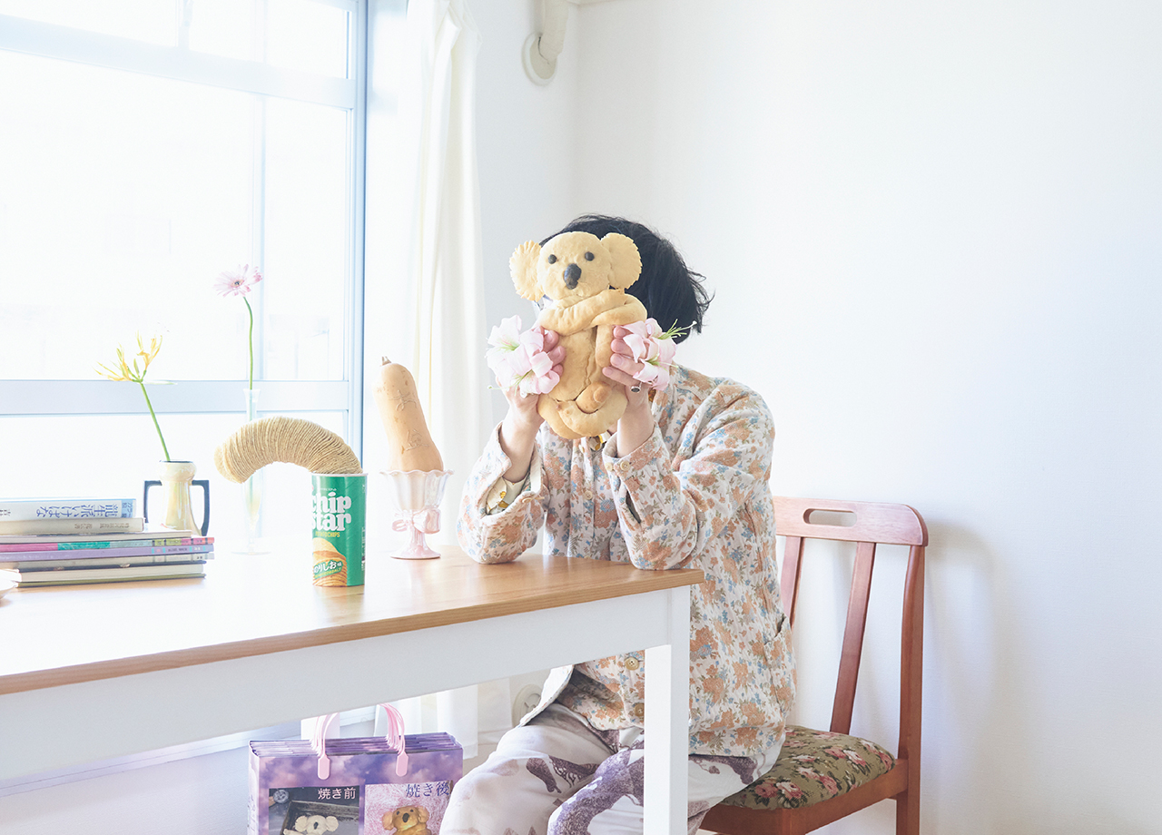 団地の一画に構えたアトリエにて撮影(顔出しNG)。団地好きが高じて入居した光差す一室。手にした自家製コアラパンは2024年、コアラ上陸40周年に寄せて展示。オリジナル紙袋(左下)も制作した。「小麦は植物、つまりいけばなです。食べてもおいしい!」Portrait : Ayako Masunaga