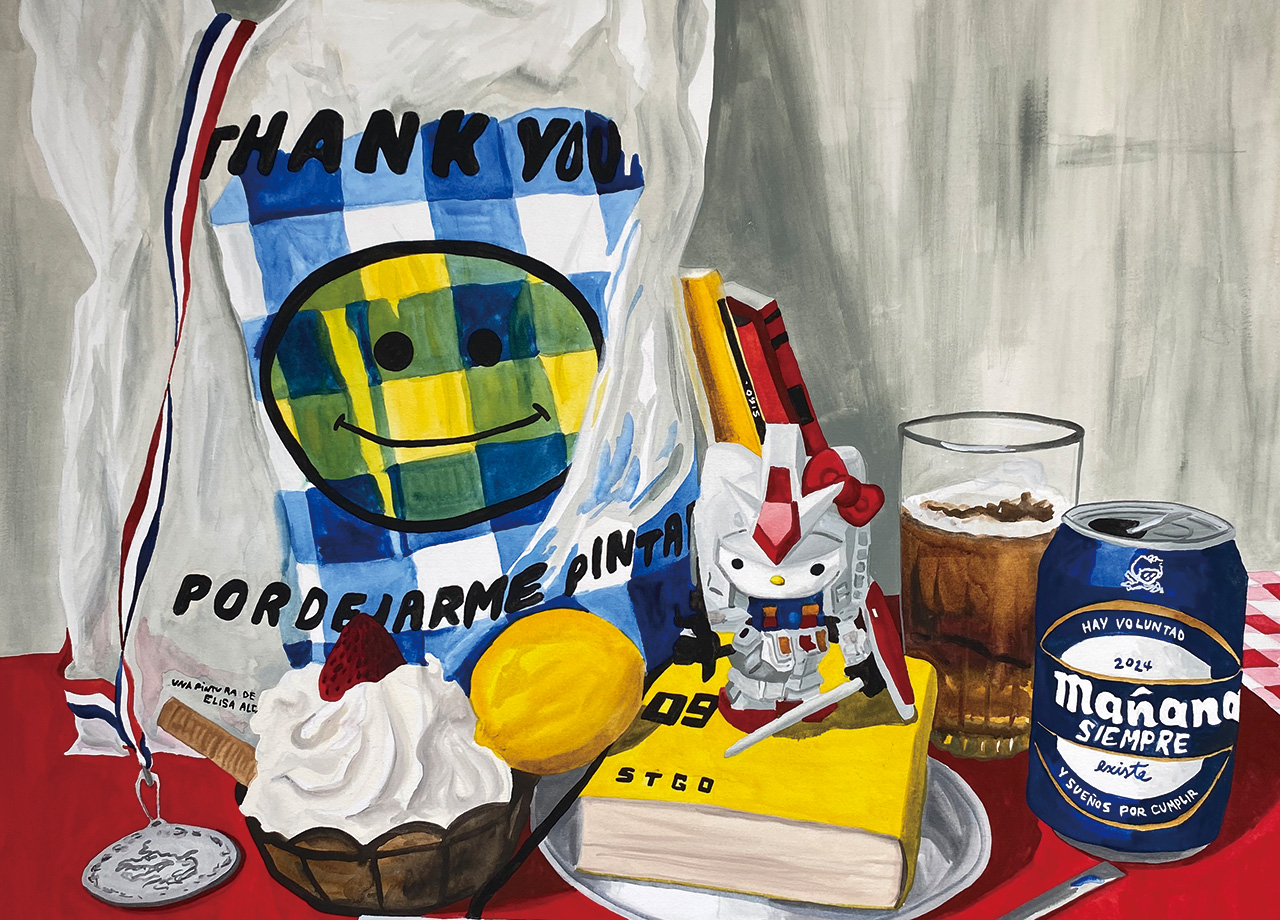 学生時代に映画を学んだ後、絵画制作を始め、チリ・サンティエゴを拠点に活動するエリサ・アルカルデ。静物画を中心に、鮮やかでポップな色彩に乗せて、日常の食卓とサブカルチャーが混在する風景やどこかアンバランスな違和感のある構図が印象的だ。