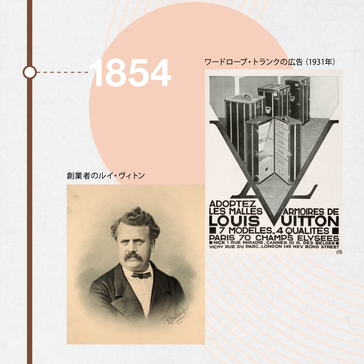 1821年、フランス・ジュラ地方の職人の家系に生まれたルイ・ヴィトン。14歳に徒歩でパリへ向かい、荷造り用木箱製造・荷造り職人のもとで修業を重ね、1854年に自身の工房を開業。平らに積める革新的なトランクは旅の文化を一新し、1859年にはアニエール=シュル=セーヌにアトリエを構える。職人技と先見性でメゾンの礎を築いた。