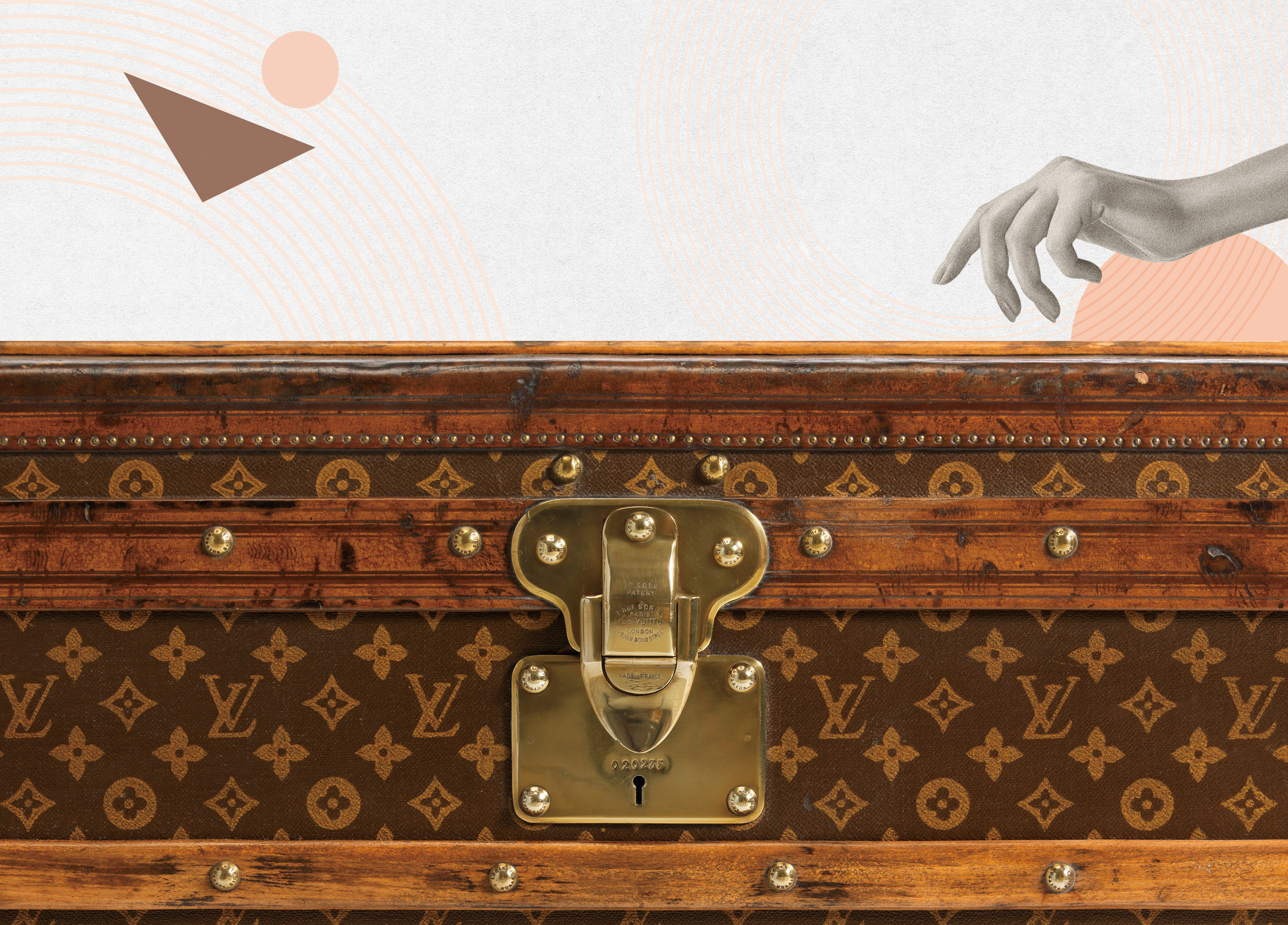 ジョルジュ・ヴィトンはモノグラムの特許を取得。ストライプ柄のレイエ・キャンバス(1872年)やダミエ・キャンバス(1888年)で培った経験を基に、実用的な模倣防止対策を、デザインへと昇華させた。モノグラムは視覚と技術の両面で機能し、特許は1905年と1908年に更新。創造の著作権における先駆的存在として、真正性を示す不朽のシンボルとなった。