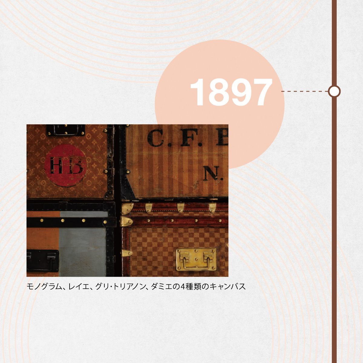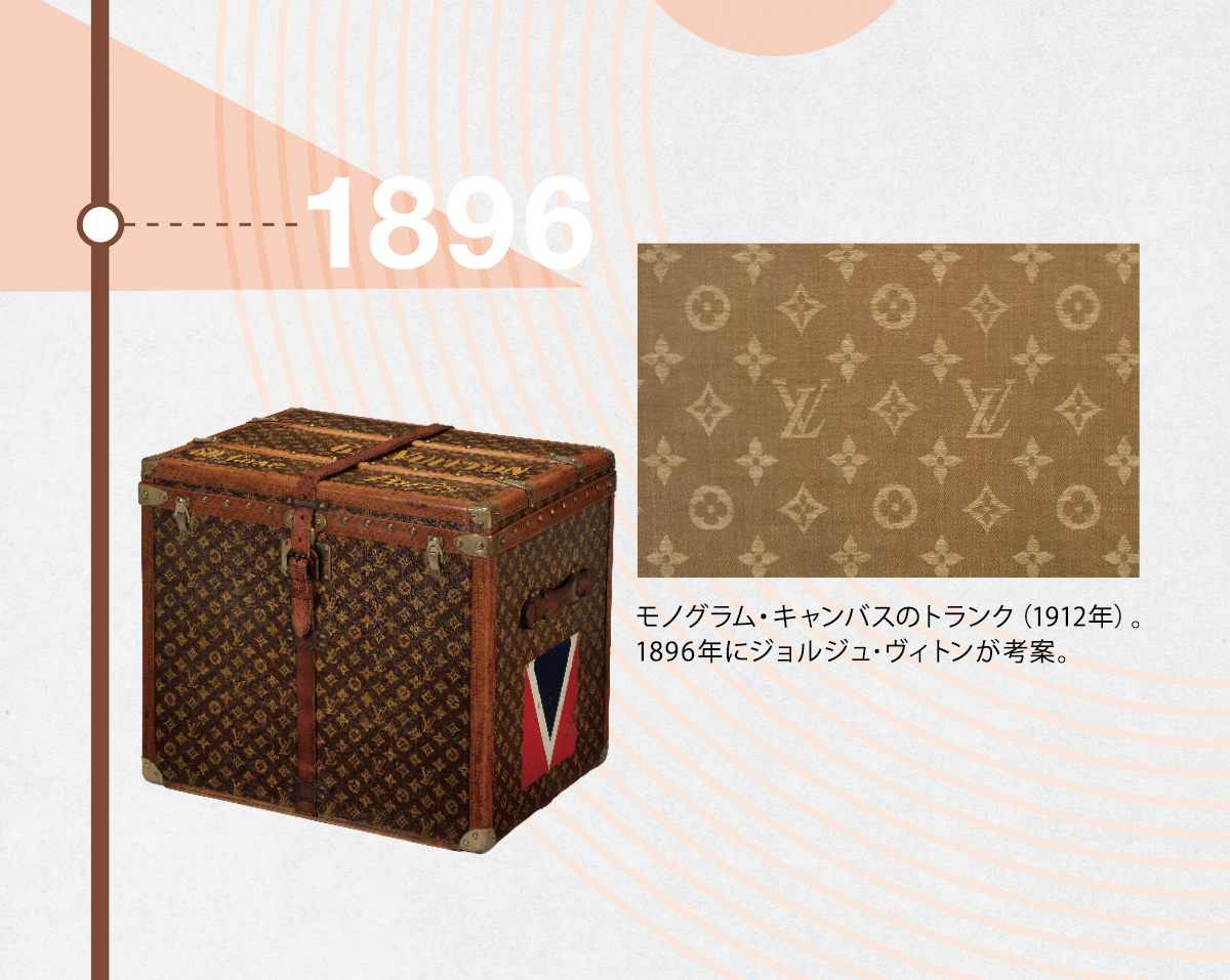 ダミエ・キャンバスの模倣対策として、ジョルジュ・ヴィトンは1892年に他界した父ルイへのオマージュを込めたモノグラム・キャンバスを考案。ネオゴシック様式の装飾やジャポニスムに着想を得て、LVのイニシャルと幾何学的なフラワー・モチーフを複雑に組み合わせた精巧なパターンを発表。製品にあしらうだけでなく、メゾンの永遠の象徴となった。