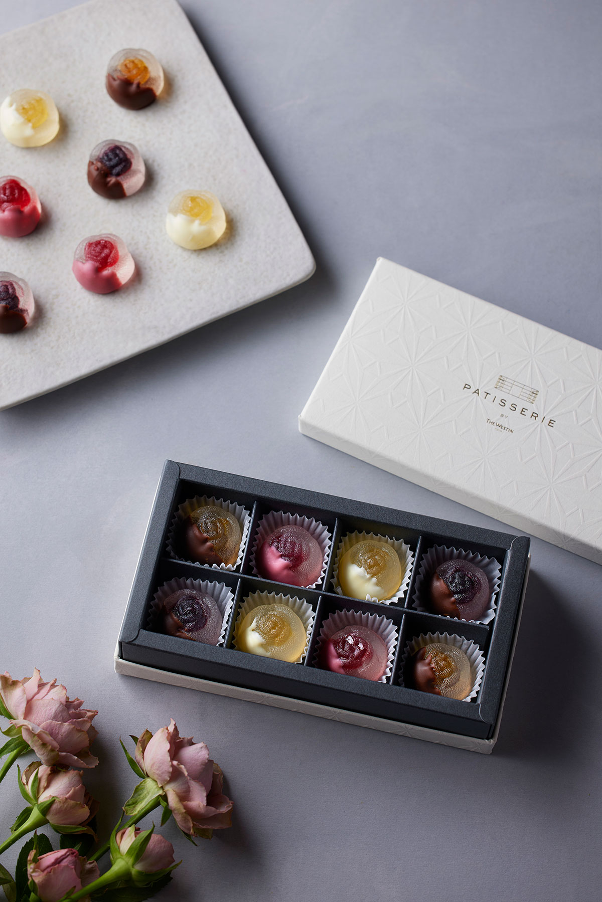 琥珀糖に果実のパート・ド・フリュイを閉じ込め、チョコレートと掛け合わせた新感覚のスイーツ。パッション×ミルクチョコレート、カシス×ビターチョコレート、ゆず×ホワイトチョコレート、赤スグリ×ルビーチョコレートの4種をセットに。琥珀糖の繊細な食感と果実の酸味に異なるフレーバーのチョコレートが重なり、上品で華やかな味わいを堪能できる。