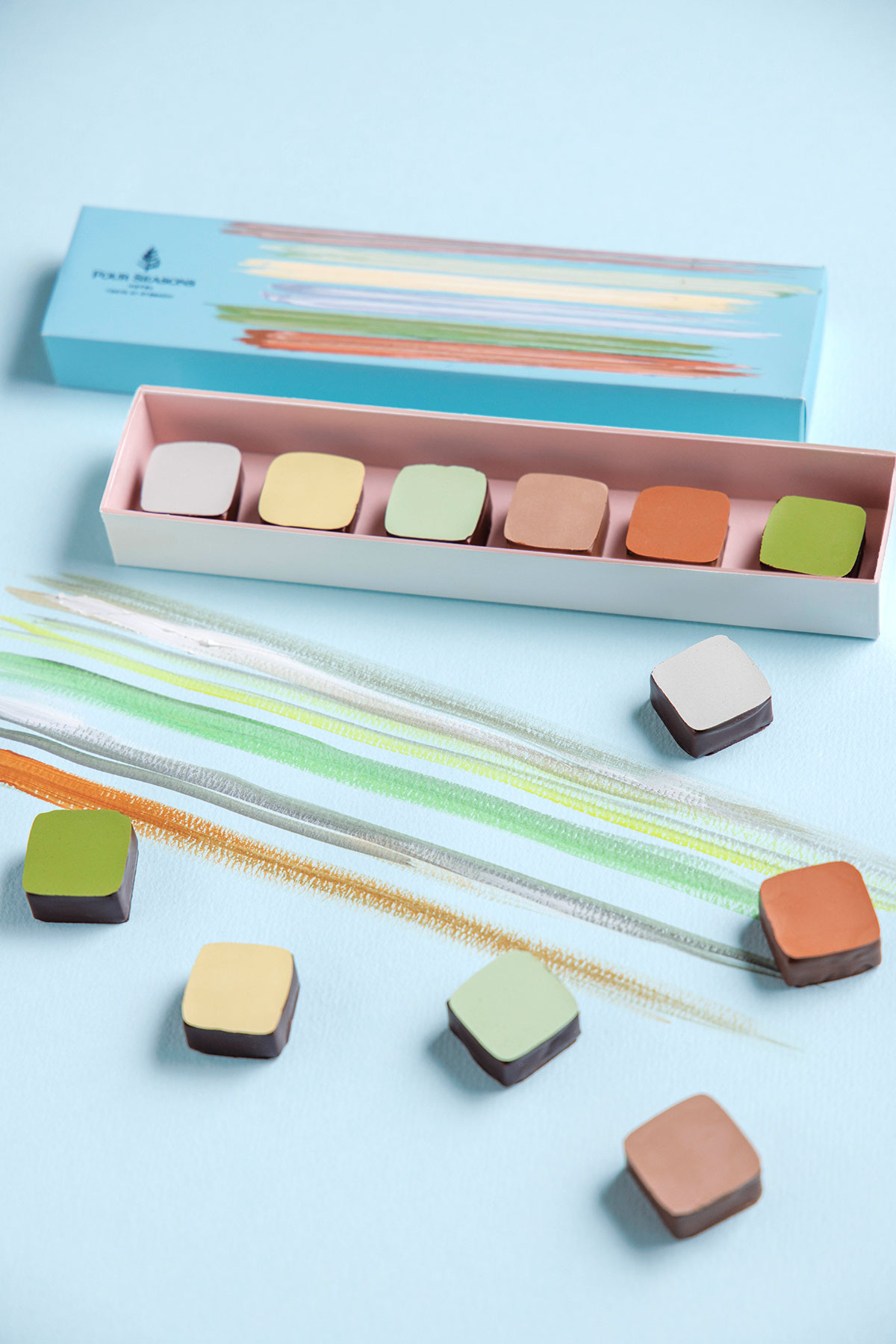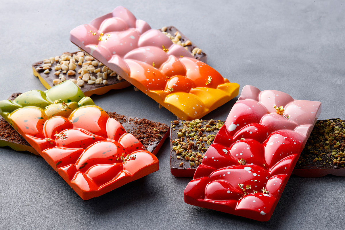 カラフルな色合いが心躍るタブレット。味わいを色彩のグラデーションで表現した3種は、ピーチとマンゴーの味わいにレモンがほのかに香る「ペッシュ」、柑橘の鮮やかな味わいをライムが引き立てる「アグリューム」、ローズの香りとグリオットチェリーやベリーの甘酸っぱさが調和する「クール・ロゼ」をラインナップ。風味豊かなガナッシュやジャムを閉じ込め、見た目だけでなく味も遊び心たっぷり。