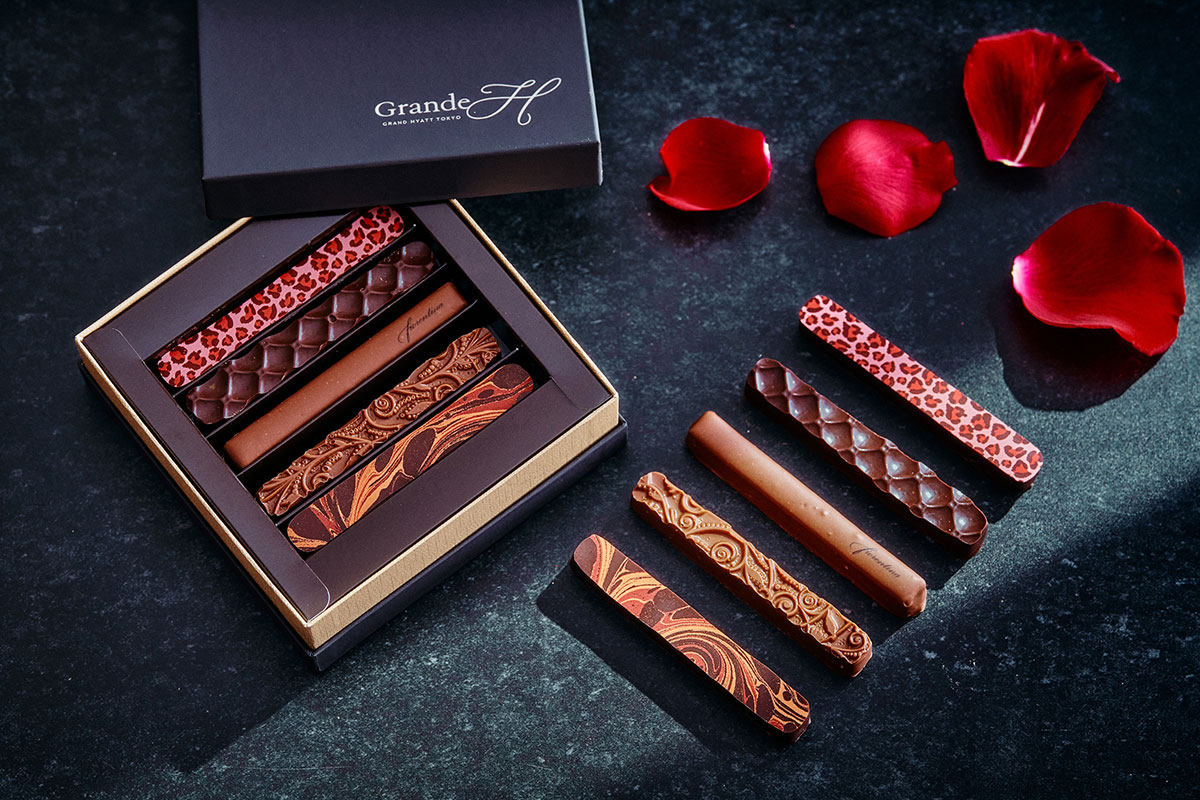 定番メニューとして親しまれている「Grande H バトンショコラ」が、バレンタインシーズンに合わせて特別感あふれるデザインでお目見え。なめらかなガナッシュを挟み込んだチョコレートバーは、繊細な口どけが魅力。フレーバーは、ホテルオリジナルの「Grande H」をはじめ、ストロベリー、抹茶、紅茶、カシスの全5種を用意。見た目も華やかな大人のチョコレートで心を掴んで。