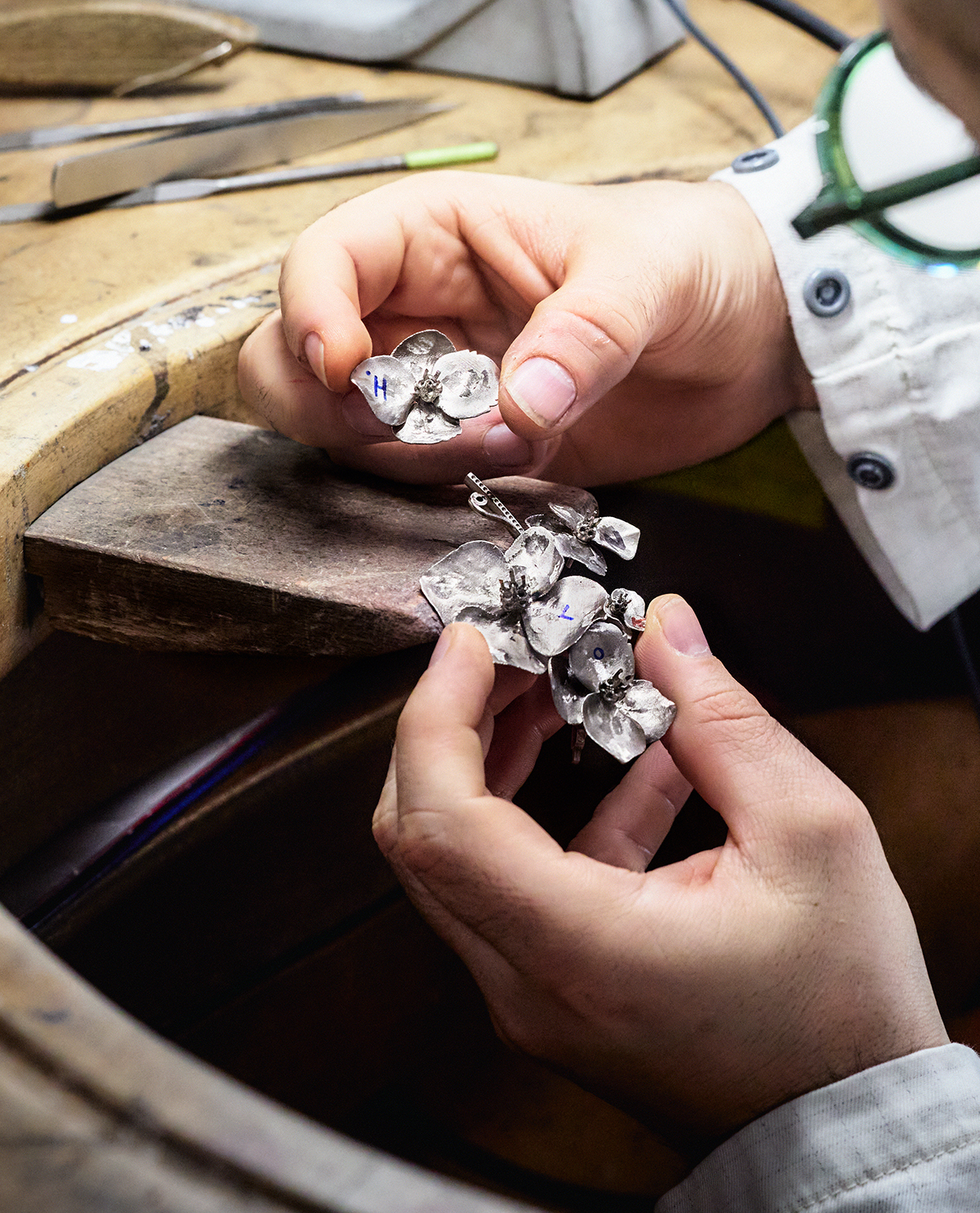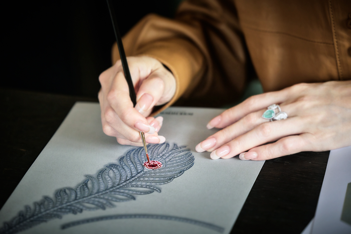 精巧なデザインをまずはメタルで形成し、ジュエリーとしての完成度を図る。アトリエではダイヤなどストーンのセッティング、ポリッシュまで職人たちによる細やかな手作業が行われる。
