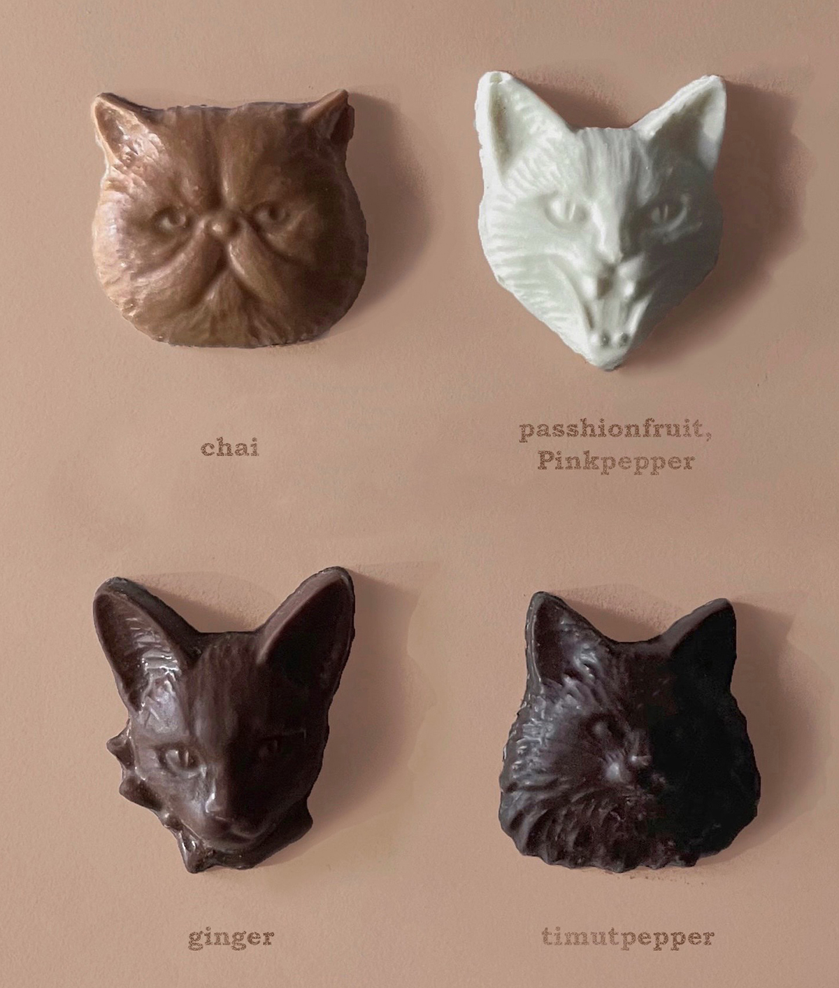「Philly chocolate」による、迫力満点の4匹の猫を型どったボンボンショコラ。甘さ控えめで上質なクーベルチュールを使い、見た目も味わいもこだわった一箱はギフトにうってつけ。それぞれ、スパイシーで大人っぽい香りのチャイ、爽やかな酸味とピンクペッパーの刺激が楽しいパッションフルーツ&ピンクペッパー、生姜の風味が温かいジンジャー、フルーティーな香りが個性的なティムットペッパーと、個性豊かな味わいだ。