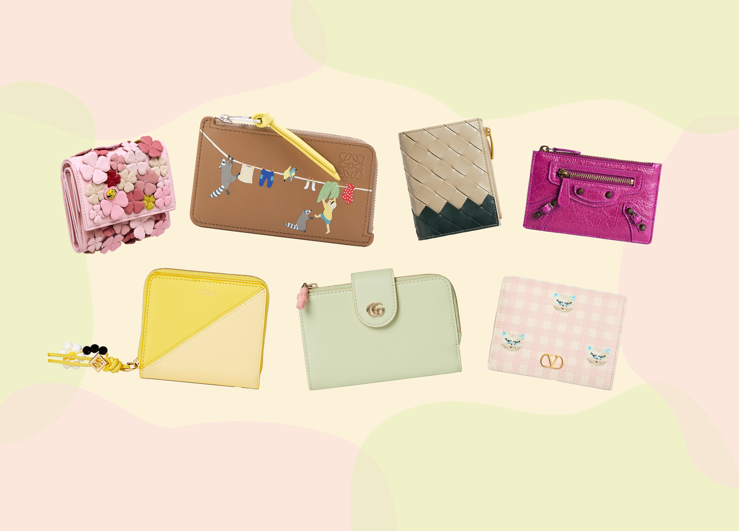 紙幣入れ、コインポケットに加え、8つのカードスロットと2つのフラットポケットが備わるミニウォレット。柔らかなグリーンとピンクのバイカラー仕立ての内側には桜のプリント、ジッパーには桜色のバンブー モチーフをあしらった、日本の春にぴったりな国内限定ウォレットだ。