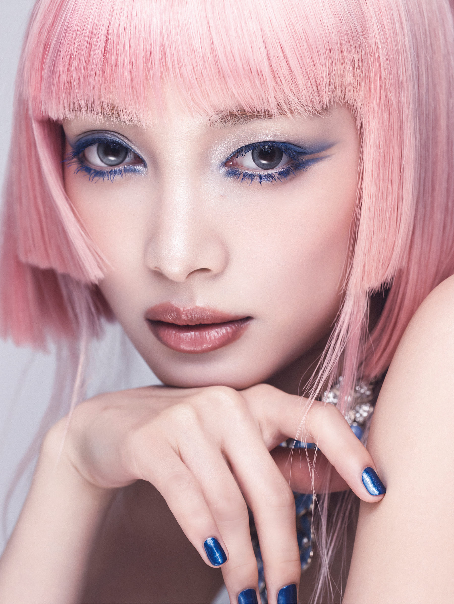 トレンドを超えて愛されるデニムの魅力を、余すことなくメイクアイテムへと昇華した〈デニム メークアップ コレクション〉。柔らかなブルーを主役に、ピンクや光のヴェールを重ねた繊細で幻想的な美しさに魅了されるルック。「主役は〈デニム ドリーム〉のアイシャドウ。ピンクやメタリックブルーを使ったアイシーなムードに、可愛さとクールさが共存するルックです」(ヴァレンティナ)
