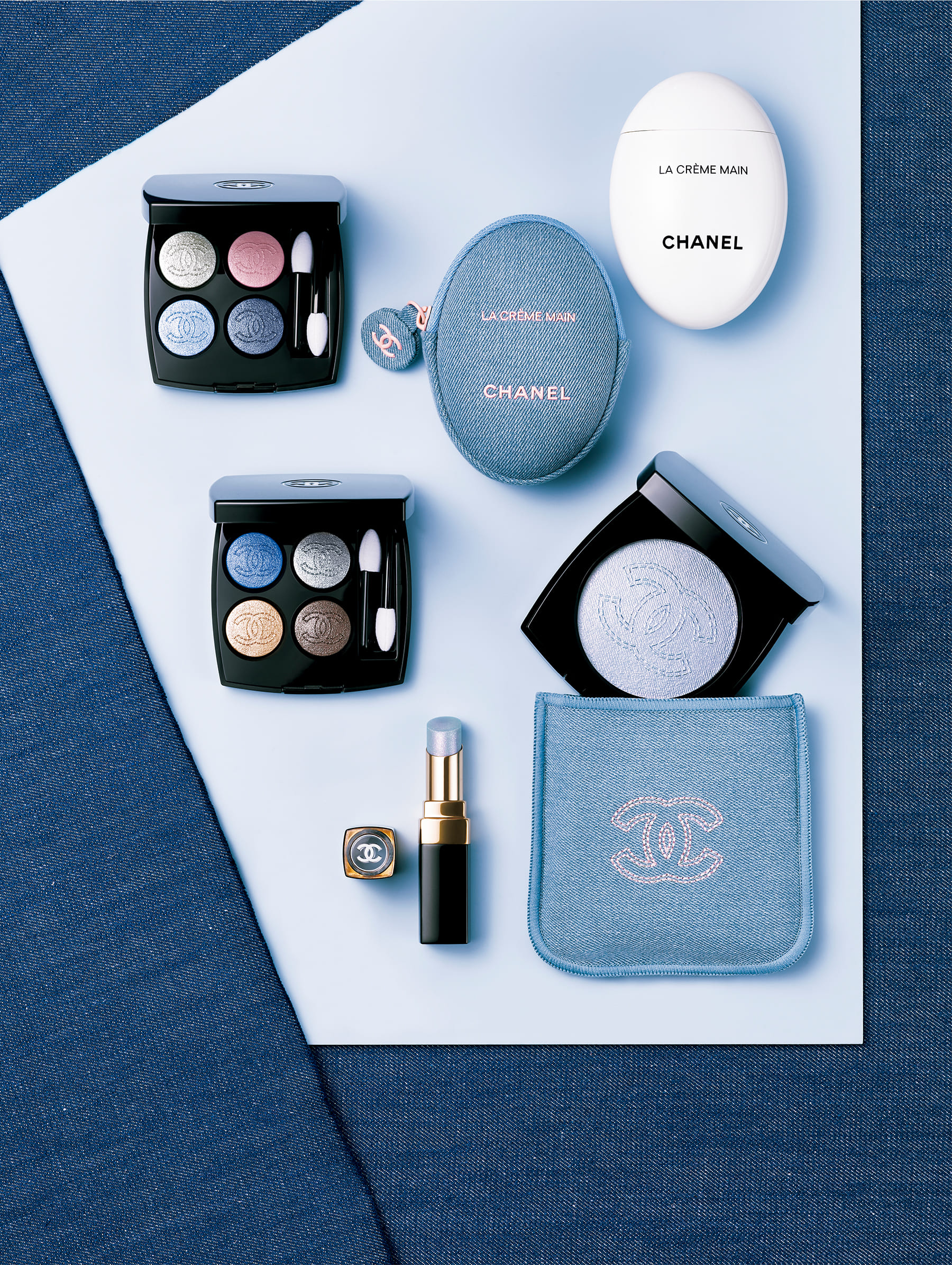 (右上から時計回りに)アイコニックなハンドクリームが、デニム ポーチを携えて限定登場。手肌と爪をケアし、なめらかな手元をキープ。ピンクのロゴが可愛いウォッシュ質感のオーバルポーチは、型崩れしにくいしっかり生地もポイント。ラ クレーム マン デニム 50ml ¥12,210 ハイライトとして頬骨や鼻筋、目元に光をとらえるフェイスパウダー。ブルーニュアンスにピンクパールが交わり、肌にルミナスな透明感をもたらす。ココ デニム ¥13,750 ピンクを秘めたブルーが、唇の上で血色感あるツヤへと変わるサプライズなブルーリップ。ルージュ ココ フラッシュ 284 ベイビー ブルー ¥6,490 アズール ブルーやシルバーに、ベージュやブラウンのヴィンテージな色調をセット。レ キャトル オンブル 29 ココ ジーン ベイビー ブルーやピンクが明るいハーモニーを奏でるアイコニックなパレット。同19 デニム ドリーム 各¥13,200(すべて限定品)/Chanel(シャネル)