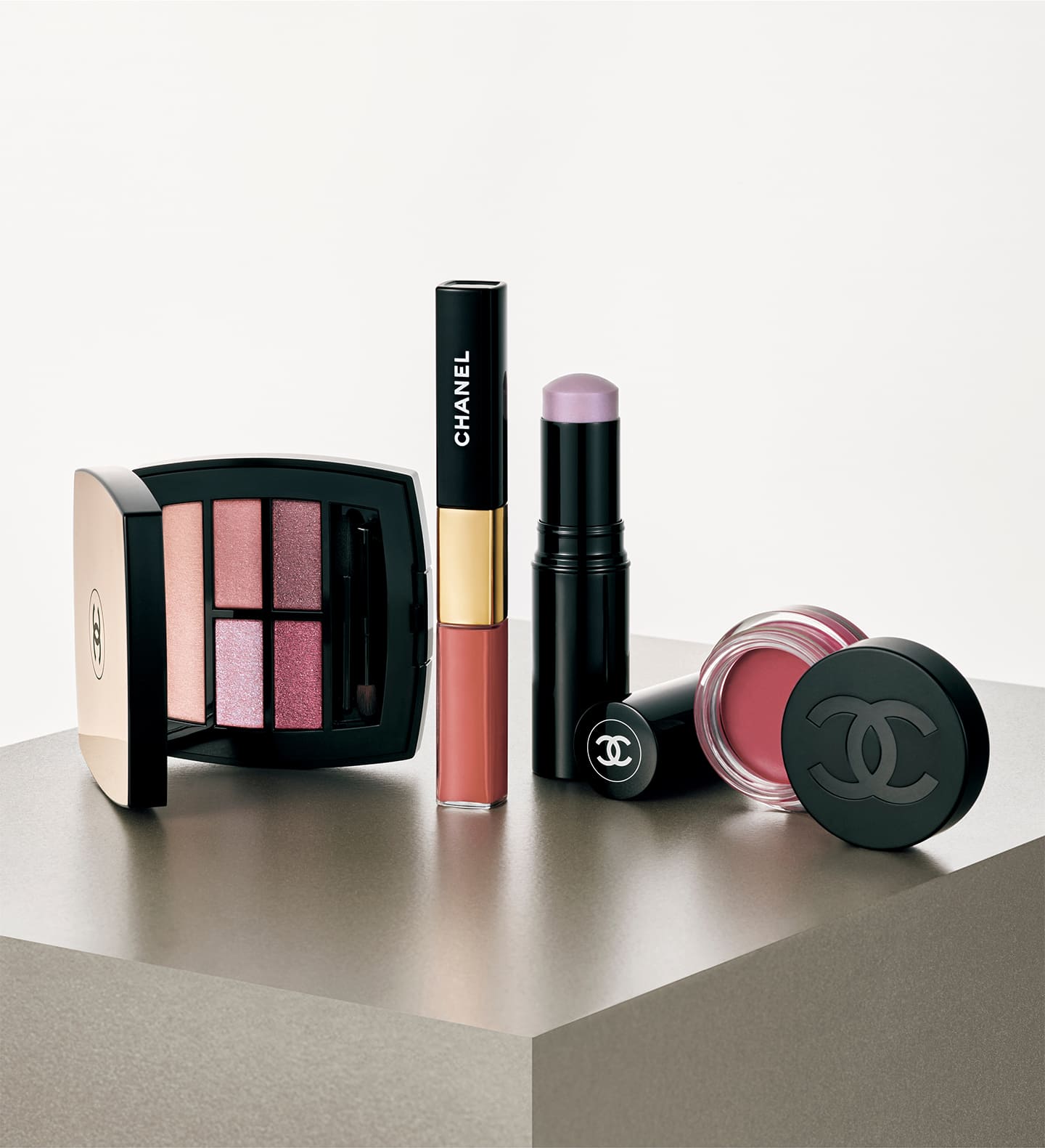 (左から)肌色とシームレスになじむ、繊細な色彩と輝きの5色アイシャドウ。レ ベージュ パレット ルガール クール ドゥ シャネル ¥11,000 リップカラーに透明グロスを重ねると、驚くほど発色が長時間持続する人気のリキッドリップ。ル ルージュ デュオ ウルトラ トゥニュ174 ¥6,490