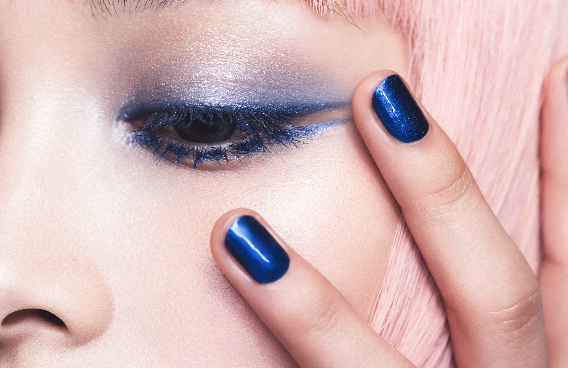 「ステッチラインは、アイラインを描いた後、綿棒で間引くようにオフするだけで簡単。ブルーを極めたアイメイクには、ブラウンのリップでヴィンテージなフィーリングを。クールな中に大人の抜け感を演出しました」(ヴァレンティナ)