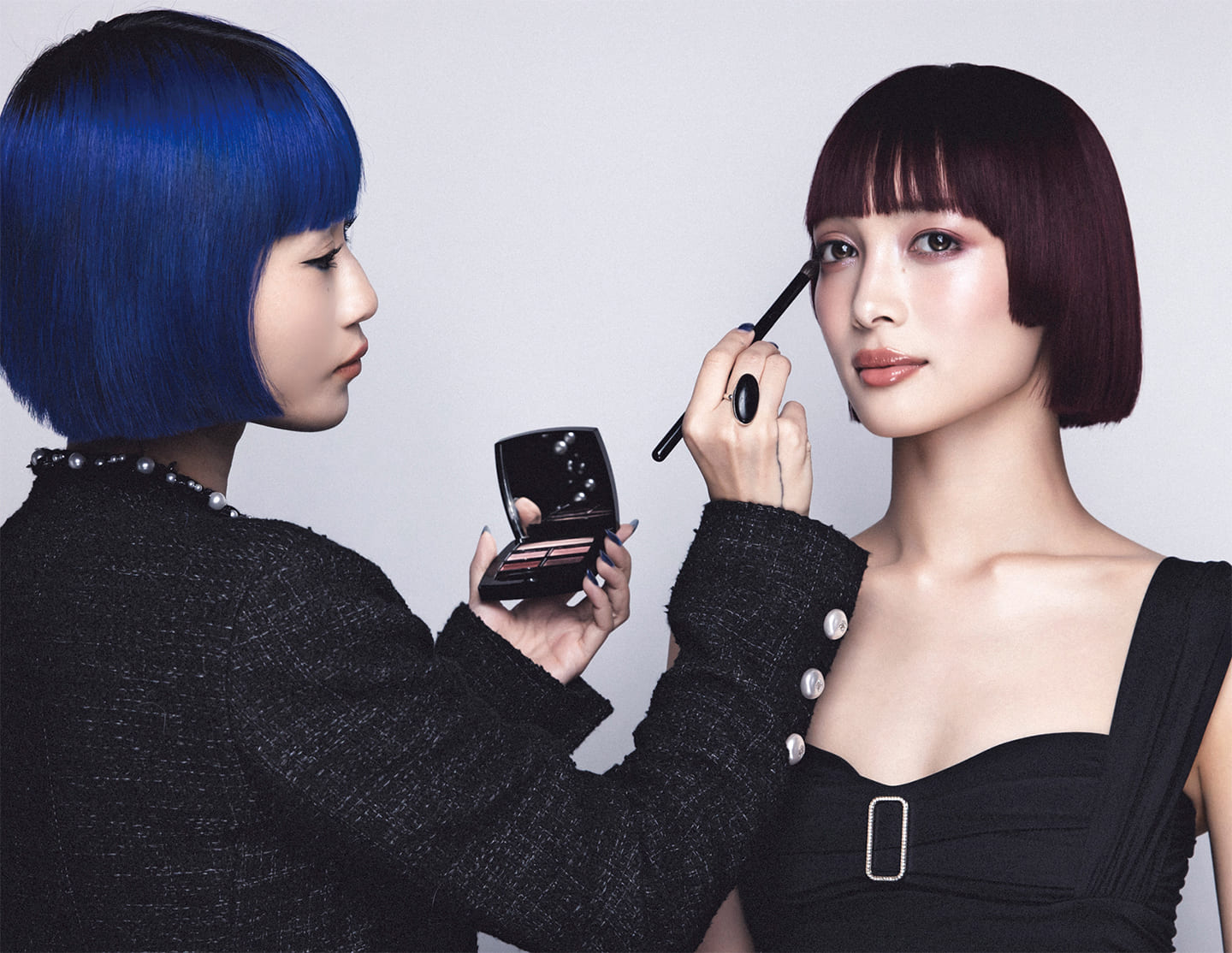 “今のJURINに似合うルック”をお題にヴァレンティナが即興でメイク。「彼女の髪色になじむパープル感のある『レ ベージュ パレット ルガール』のアイシャドウをまず選びました。チークは『リップ&チーク ボーム N°1 ドゥ シャネル』で血色感をプラス。リップはピンクベージュの『ル ルージュ デュオ ウルトラ トゥニュ』で顔全体を明るいトーンに。全体的な赤みを中和するように、『ボーム エサンシエル』のライラックのニュアンスをハイライトで足すことで、意外なサプライズを生み出しています」。トーンの異なる色を洗練ルックにまとめあげる、ヴァレンティナ流の色彩の魔法で、JURINらしい個性がさらに花開いて。