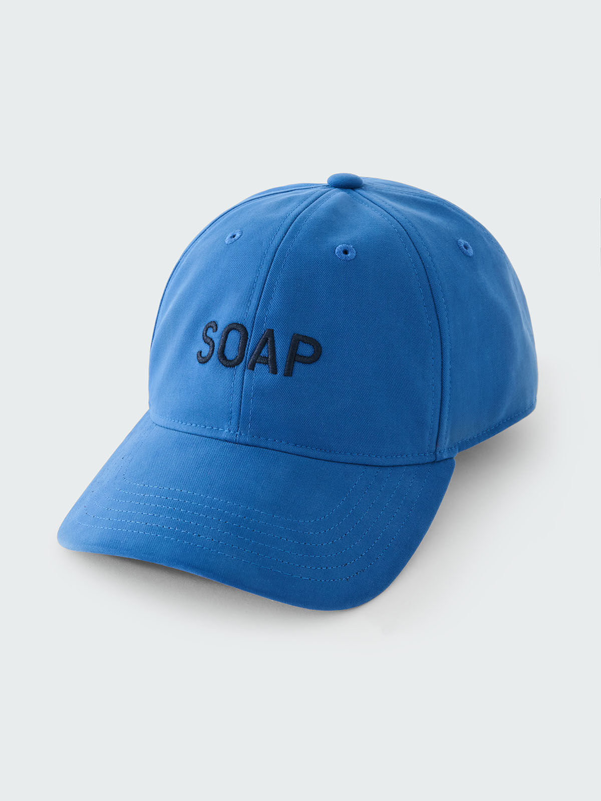 鮮やかなブルーのコットンに「ソープ」の刺繍を施したベースボールキャップ「ソープ キャップ」¥18,700