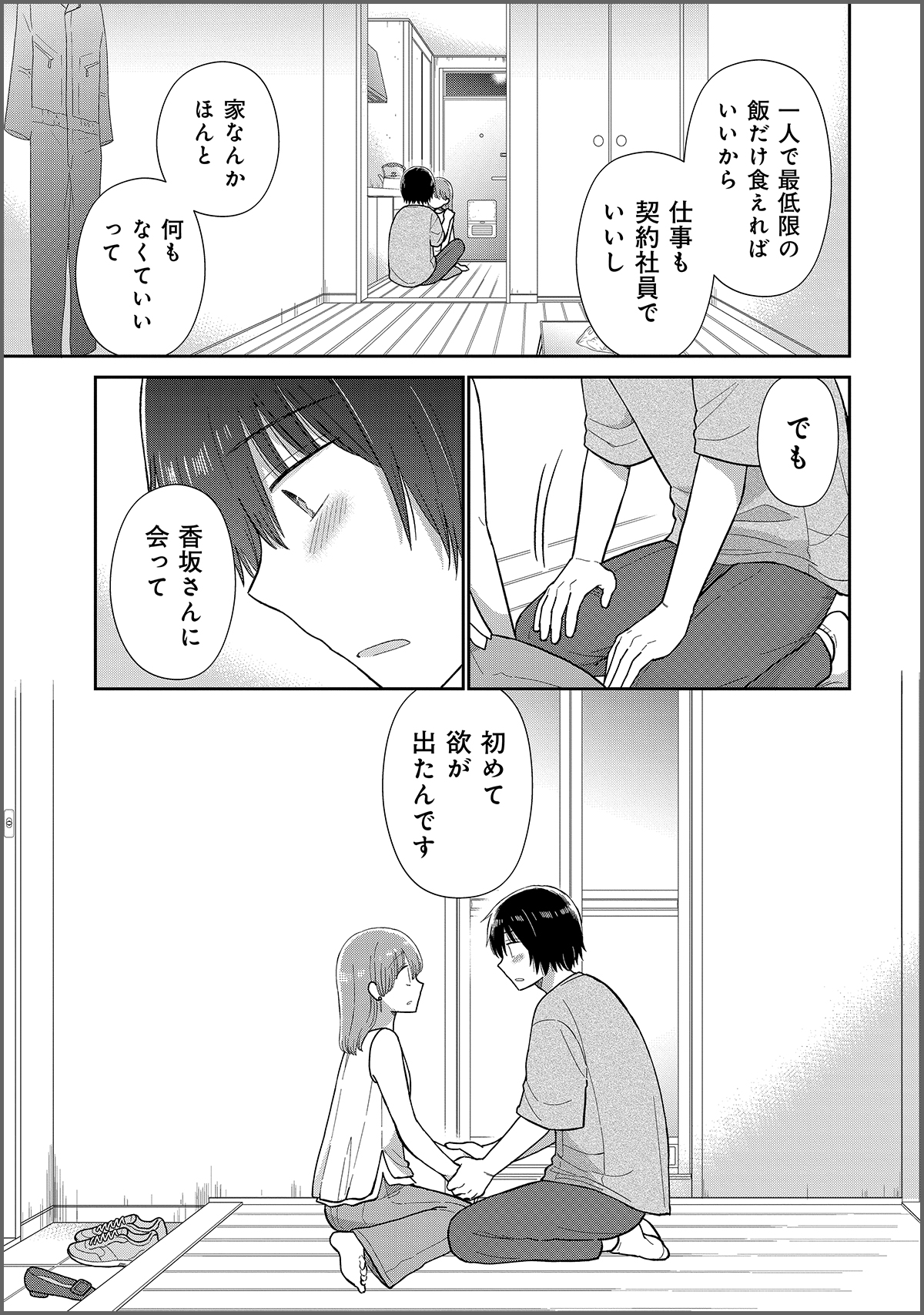 本作はその歩みを、双方の視点から描いていく。ぎこちなく、不器用なふたりのやり取りは、思わず頬がゆるむほど初々しく、静かなときめきを運んでくる。なかでも印象的なのは、想いが通じ合った先で、鍵谷のなかに『欲』が芽生える瞬間だ。恋をしなくても人生は成立する。それでもなお恋が人生にもたらす揺らぎやその尊さ、抗えず惹かれてしまう理由をそっと教えてくれる」