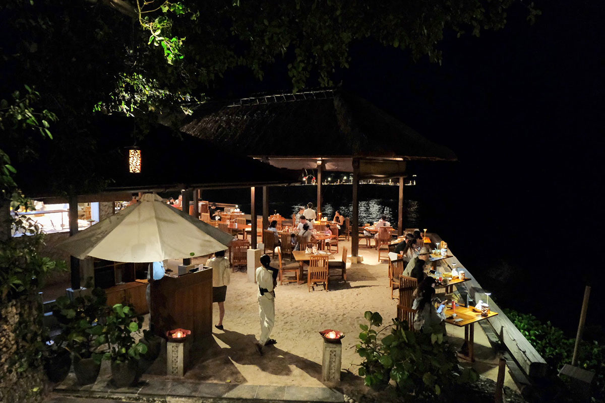 「ロックバー」に隣接する「キシック」は、波音とともに味わうバリ風シーフードバーベキューレストラン。砂の上にテーブルが設えられ、海沿いの席は目の前まで波が打ち寄せるオーシャンフロントならではの開放感だ。ここでは、その日に近場で水揚げされた新鮮な海の幸から好みのものを選び、炭火で豪快に焼き上げてもらえる。