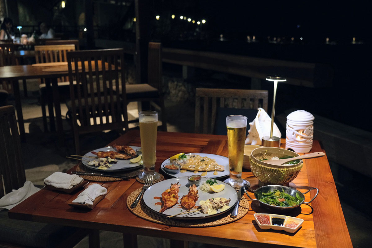 波打ち際のテーブルでバリ風シーフードバーベキューを味わう「キシック」