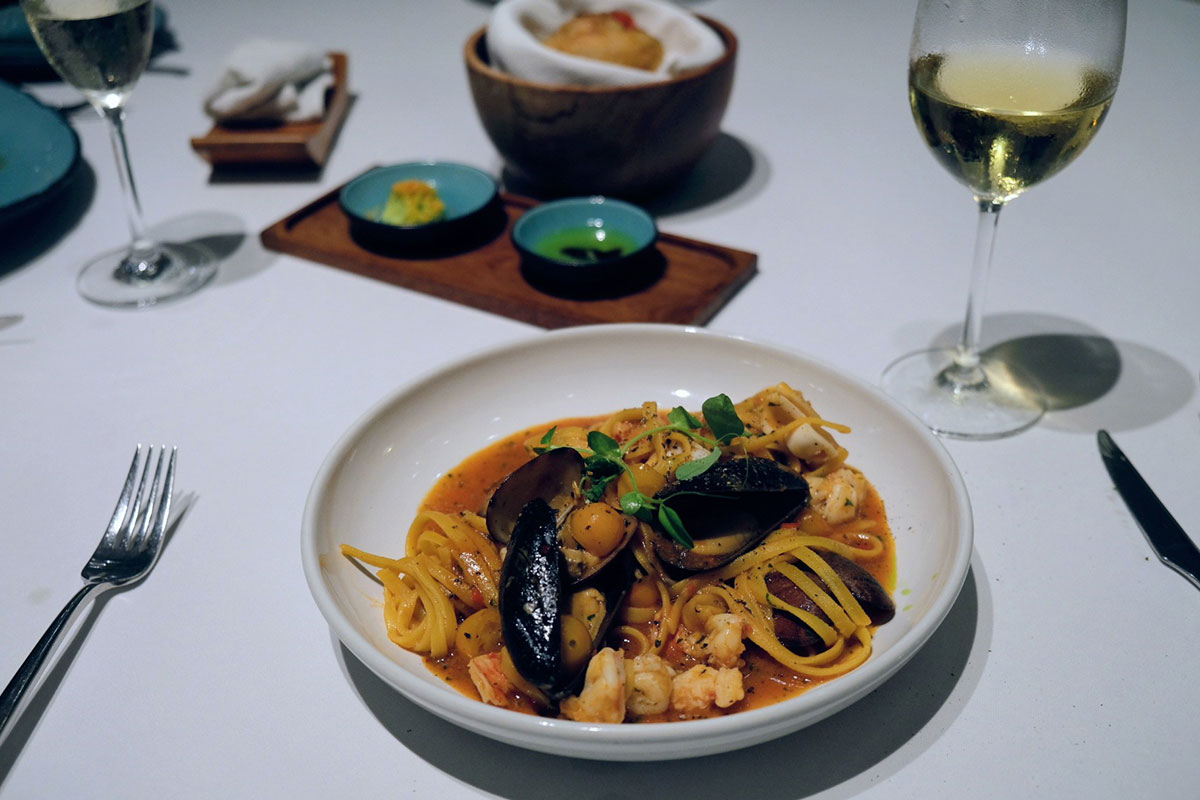 メインに選びたい「タリオリーニ マリナーラ」は、ムール貝やアサリ、エビやイカなど魚介の旨味が太めのパスタにしっかりと絡み合い、芳醇な海の香りが鼻腔をくすぐる。シャンパーニュをはじめ、イタリアやスペイン、ポルトガルなど、バリ島最高峰の地中海ワインリストもお見逃しなく。