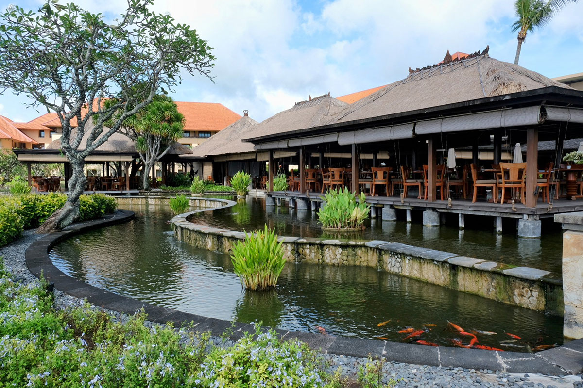 インドネシア伝統の温野菜サラダ「ガドガド」や「ナシゴレン」、タイのスパイシースープ「トムヤムクン」、カッテージチーズを使いバスマティライスを合わせた「インドカレー」など、どれもシェフたちのクラフトマンシップが光る。美しいロータスの池に囲まれた、バリ島らしい屋外レストランの風情にも癒やされるはずだ。