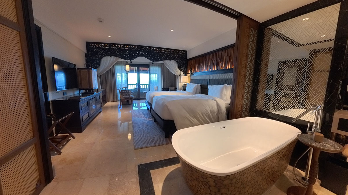 294室の客室はすべて52平米以上のゆとりを持ち、大理石のバスルームには深いバスタブが備わる。世界的建築事務所「WATG」が手掛けた空間は、バリ島内の村々で作られた木彫レリーフや、カマサン様式の天井画といった伝統工芸と現代的なミニマリズムが交差する静謐な佇まいだ。