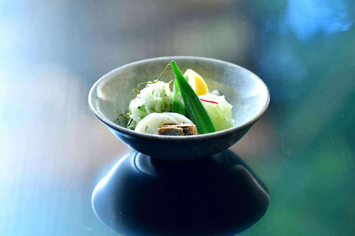 料亭のもてなしとは、盛り付けの美しさ、器との調和、空間の設えとあらゆる面の気配りによって成り立つもの。その文化を現代につないできた加賀料理は昨秋、登録無形文化財に認定。「つる幸」では蔵に保存されていた由緒ある器も継承しており、九谷焼や古伊万里、輪島塗ほか麗しい器の数々が料理をさらに引き立てている。