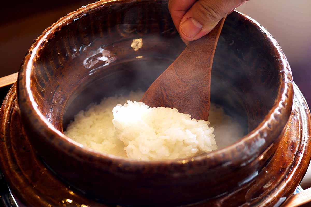 能登の米を炊き立てで。艶やかな飴釉が印象的な金沢を代表する窯元、大樋焼の土鍋と(上)。地元野菜の香の物(左)と、希少な能登牛を炊いた一品(右)。