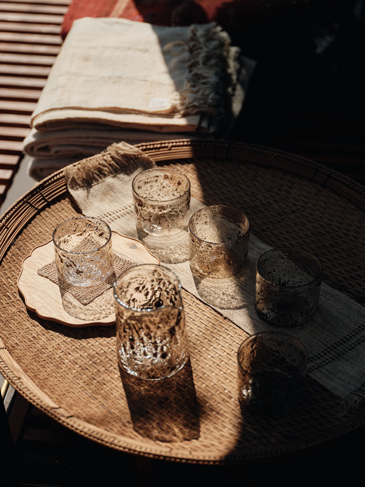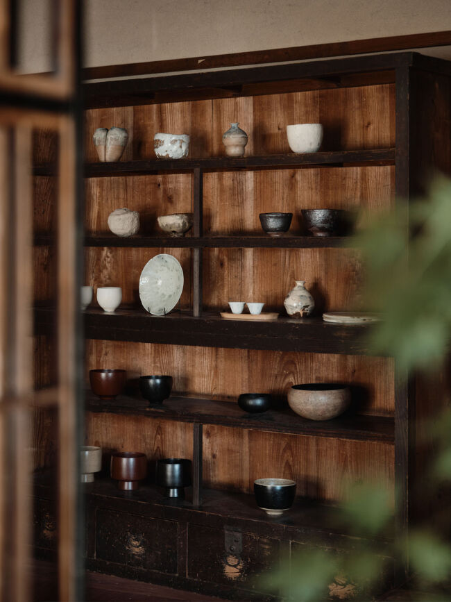 大野さんのセンスが感じられる内装。ひがし茶屋街からも徒歩圏内(上)。ガラスは金沢卯辰山工芸工房の森安音仁作品(左下)。旅の思い出に手に入れたい器たち(右下)Photos:Nik van der Giesen