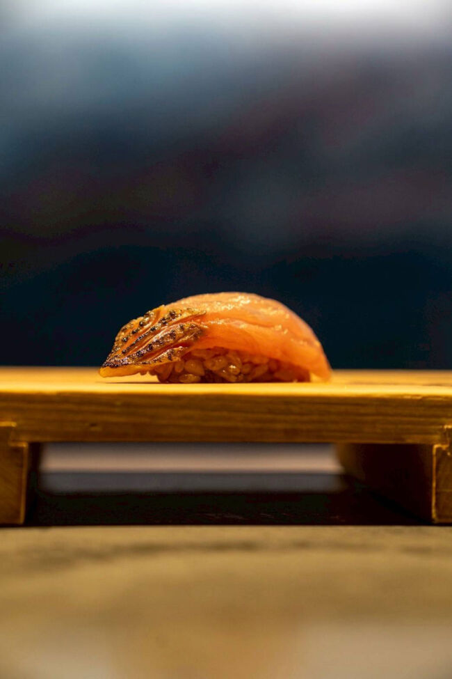 ミシュラン一つ星を獲得し、富山で人気を博した木村泉美大将による鮨の名店「人人 (じんじん)」が、昨夏金沢の大工町に移転。1Fの「立ち喰い鮨 人人」は、日本のファストフードである鮨本来の姿で、気取らず楽しめるのが魅力。その心意気を伝えるべく“立ち喰い”とあるが、実際は着席スタイル。店内にはロックや昭和歌謡などが流れ、グルーヴ感満載。日曜など大将自らが握ることもあり、テンポ良く振る舞われる鮨とともに、さながら木村劇場が繰り広げられる。