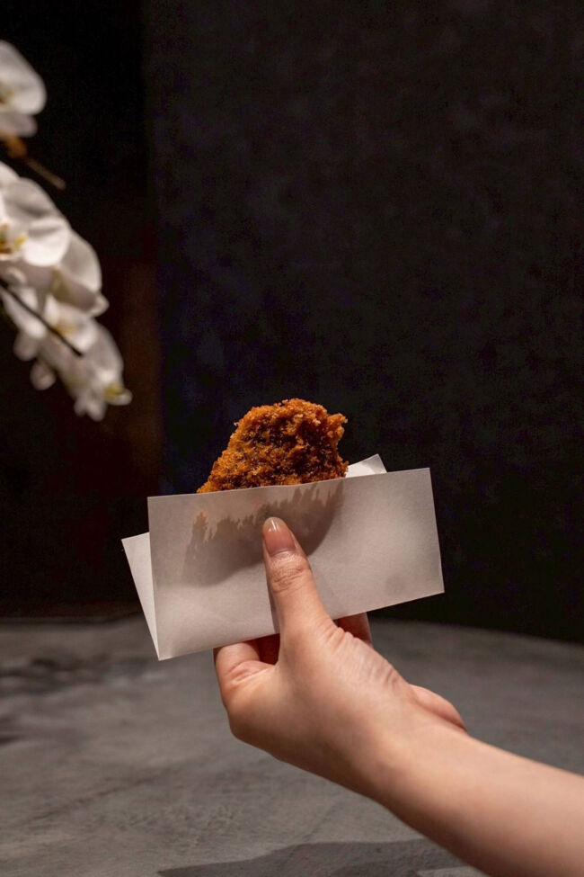 甘エビをはじめ北陸の旬のネタの握りのほか、富山ならでは桜鱒の押鮨など、鮨8貫に梅の茶碗蒸しとお椀で¥4,180といううれしい価格設定。短時間でいただけることも、旅には使い勝手がいい。米はもちろんのこと、創業400年の奈良の蔵元で学び、赤酢もオリジナルでつくるというこだわりぶり。酢には砂糖を使っていないため喉渇きが抑えられるのだとか。追加オーダーしたいのは揚げ立て、ひと口サイズで手渡しされる名物のアジフライ。マリアージュには、ぜひこだわりのレモンサワーを!