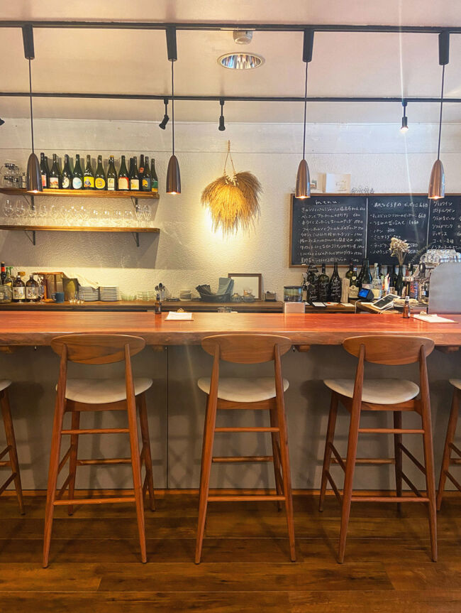 メニューは月毎に変わるが、オープン時からのメニュー、イタリア料理のゼッポリーニは必食。このほかちょこっと小皿料理、定番のプレーンオムレツやグラタンも人気メニュー。どれも地元素材を生かしつつ、程よくひねりの効いた味わいで、ナチュラルな白ワインが進むこと請け合い。気に入れば「rue.」で購入することも。旅好きの店主が各地で見つけた食材にも新しい出合いがあるはず。