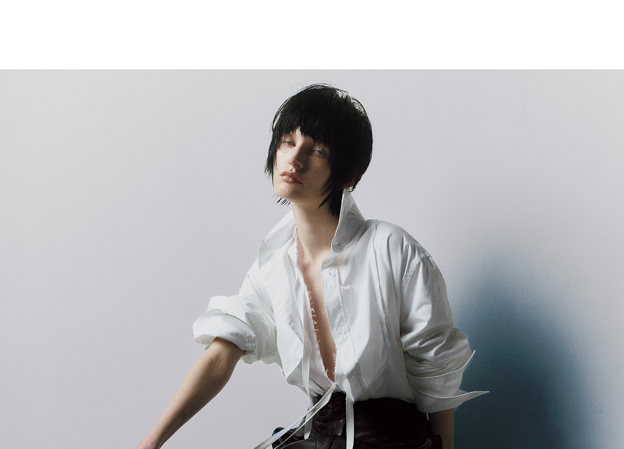 「シャツは素材違いでダブルに重ねるスタイリングが好きです。今回はホワイトのシャツをレイヤードして、襟元の構築的なバランスで遊んでみました。ひとつはタフな素材、もうひとつはフォルムがきれいに出るものを選ぶのがポイント。オールインワンに重ねてユニセックスなムードにしつつ、オールホワイトでモダンな印象に仕上げてます」