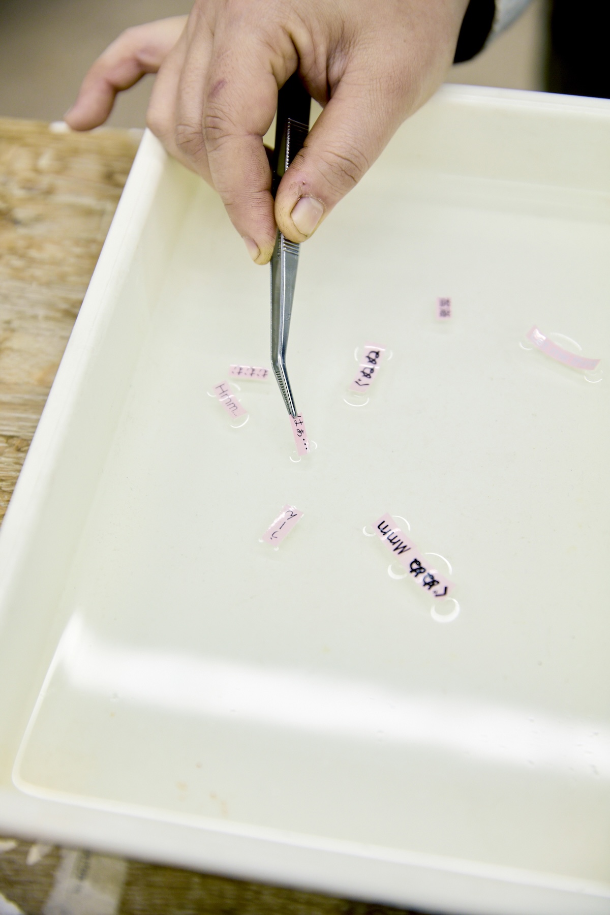 陶芸用の転写シートを用いガラスに言葉を貼り付けたのちさらに焼成する。