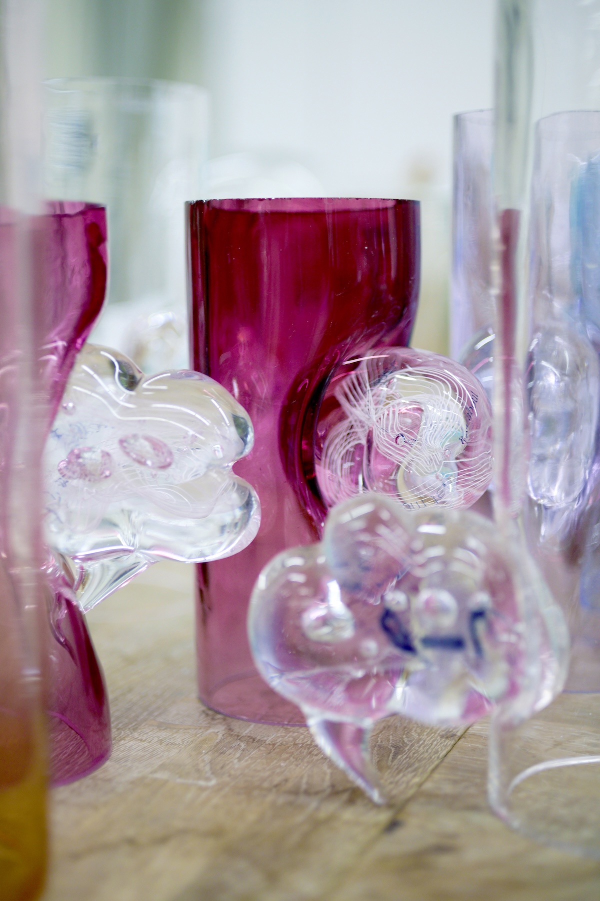 「そうですね。ガラスにこんな世界があるんだと衝撃を受けました。ガラスと言えば、大きくいうと、器や窓ガラスなどが大多数のイメージではありますが、特に吹きガラスだったら器が当たり前でした。それなのに、そのときのナンシーさんは巨大なコマを作ったりしていて、それを見ているうちに、こういうのをやってみたいと思うようになって。紹介していただいたキャサリンさんもいろんなものを作るんですけど、大学に通い始めて、先生を選んでよかったと実感しました。在学中は毎週末、キャサリンさんが吹きガラスをやってたので、お願いして、アシスタントさせてもらっていました」