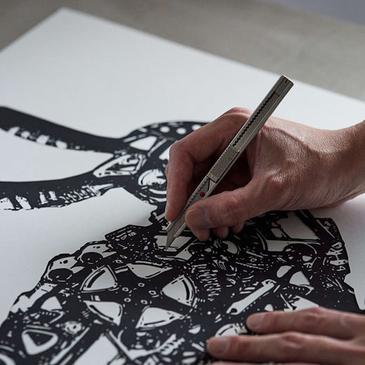 白と黒の紙の重なり、カッターナイフ一つで精巧緻密に像を切り出す。アーティスト平野千明は、自然に見立てた紙を切り開くことで可視化される存在をコンセプトにアートワークを行う。動物をモチーフとした造形を通じて、生物進化と人間文明との相互作用を視覚的に探る「現代型進化論」シリーズ。作品に刻まれた抽象的な文様は、進化の軌跡と文明の構造とが複雑に交錯する過程を象徴し、動物のフォルムそのものを、生命史と人類史の交点として再定義する。