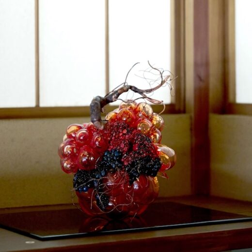 金沢を拠点に、吹きガラス特有の形や現象と自身の生命観の間で制作するガラス彫刻作家・寺澤季恵。腐敗や死から「生」を表現するモチーフや集合体には、不気味さと美しさが共存する。独特な色合い、ステムに増殖する粒々、泡のような、生命体のような造形のアーティスティックなグラスたちが不思議な存在感を放つ。