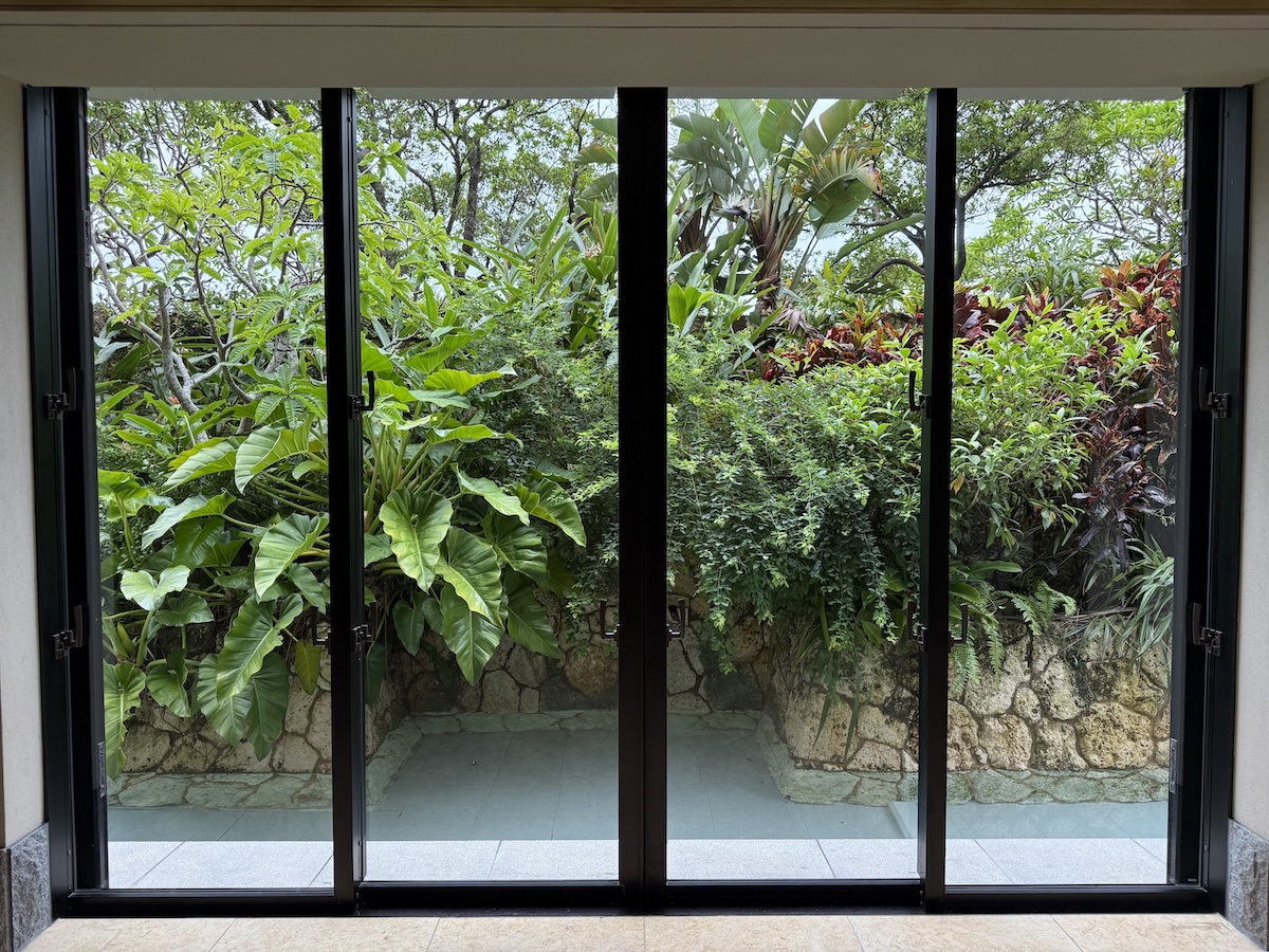 那覇空港から車でおよそ1時間半。ゆるやかな緑の丘を抜けてたどり着いたのは、名護の高台に佇み喜瀬カントリークラブの一角に広がる、ゴルフ&スパリゾートのザ・リッツ・カールトン沖縄。門の前でまず迎えてくれたのは、立派なツインのシーサー。その堂々たる姿に一瞬背筋が伸びてしまうけれど、琉球建築をモチーフにした館内へ足を踏み入れると、天井高のロビーからは沖縄のやわらかな風が吹き抜け、三線の音色がふんわりと響いてくる。そして、ロビーの奥には、水盤が静かに広がり、この日はあいにくの梅雨模様でしたが、それすら美しい景色の一部だと思えるほど! 静かな水の回廊を歩くと、鳥のさえずりと沖縄らしいサウンドが心地よく、一歩一歩進むたびに日常のざわめきがなんだかほどけてゆく──。チェックインを終える頃には、私の心はもうすっかり“旅モード”に変わっていました。