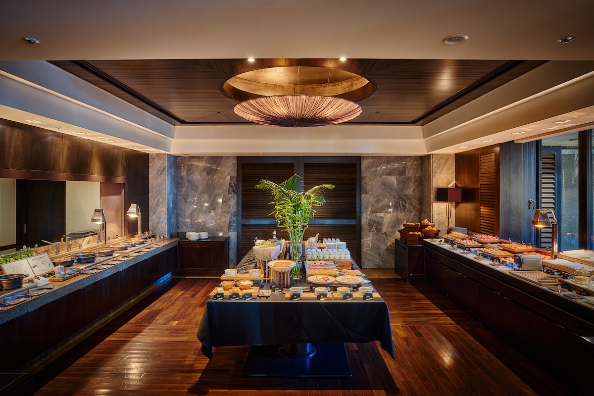 人生初の空手で心身ともに目覚めた後は、お腹もすっかり準備万端。ザ・リッツ・カールトン沖縄の朝食は、ダイニング「グスク」にて朝7時から。木の温もりが広がる空間は、まるで琉球の“離れ”に招かれたようなムード。旅気分と沖縄らしさを同時に体験できるビュッフェスタイルの朝食がこちらでは楽しめます。