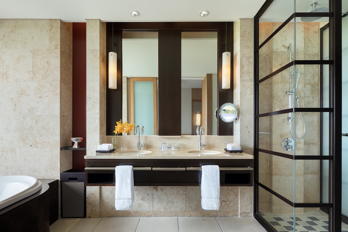 バスルームの扉を開けると、やわらかな自然光がたっぷりと差し込む広々とした空間。レインシャワーにエレガントなバスタブ、そしてアメニティは「Diptyque(ディプティック)」で統一。沖縄の海塩を使った「美ら海バスソルト」やバスピローも用意されていて、五感から癒される贅沢な時間を楽しむことができます。あいにくの天気でしたが、雨に濡れた木々を眺めながら、バスタブにゆっくりと浸かり、ふわふわのタオルに身を包んだ時、「あぁ、The Ritz-Carltonに来たんだな」とじんわり幸せを実感できた時間でした。