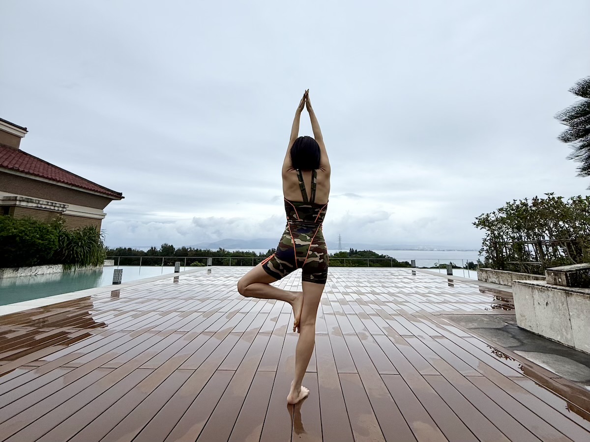 小雨の中、記念にヨガのポーズをイメージでやってみました(笑)。