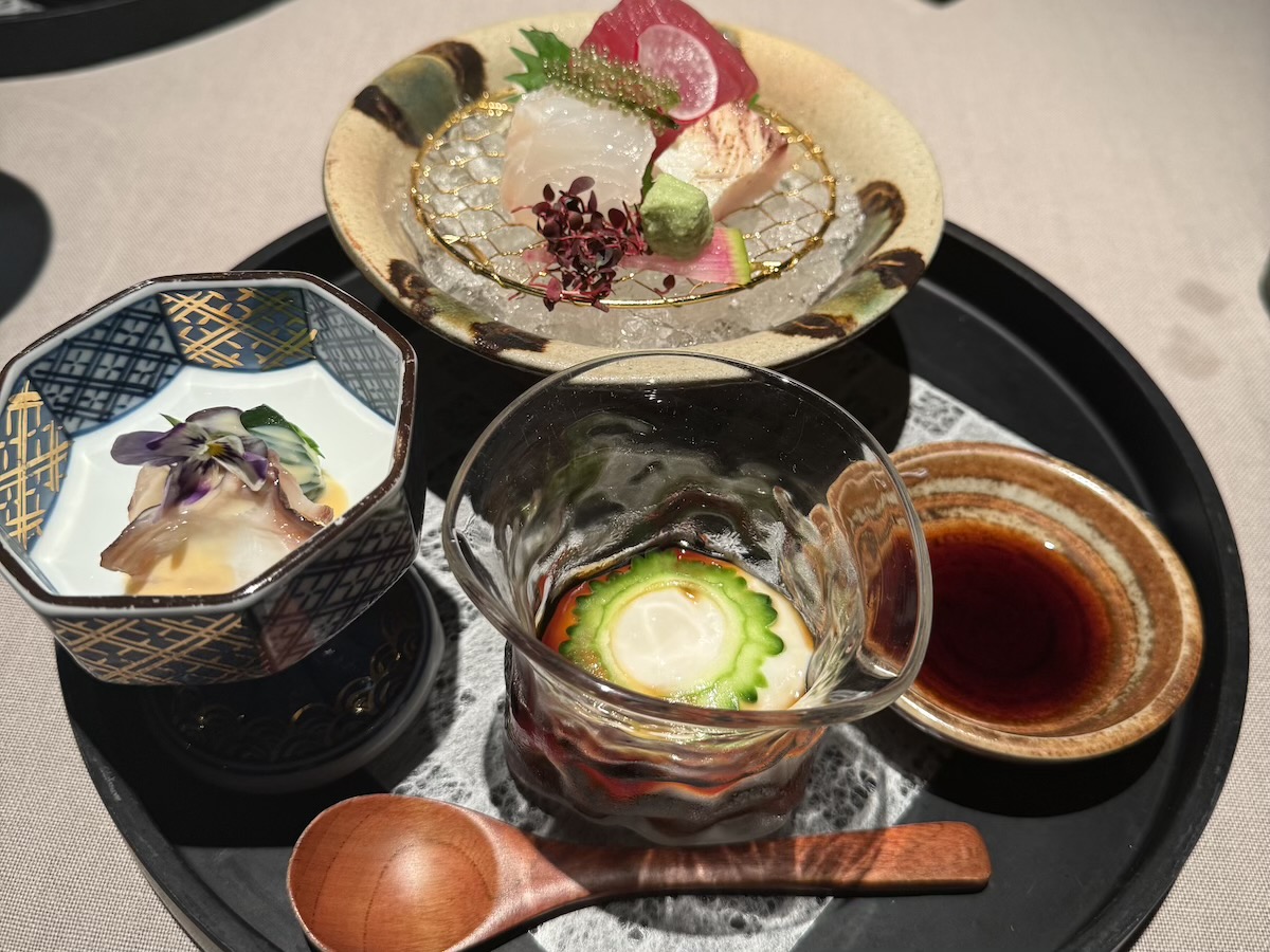 まずは、お造り三種の盛り合わせ、ジーマミー豆腐、もずくなどが美しく並ぶ前菜からスタート。小鉢の一つ一つに手がかけられていて、沖縄食材の優しい味覚が、身体に染み込んでいきます。メインはあぐー豚のしゃぶしゃぶ。出汁の湯気に包まれながら、さっと火を通していただくバラとロースの美味しいこと! あっさりしているのにコクがあって、とろけるようなやわらかさ。シメは雑炊か沖縄そばが選ぶことができるのですが、やさしいお出汁の味わいで、身体が喜ぶコースでした。