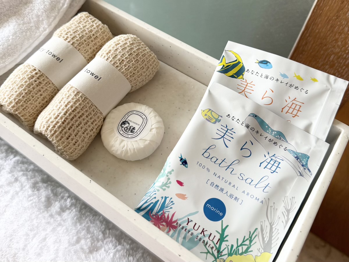 いつまでも沖縄のキレイな海が続くよう、環境への負荷を最小限に抑えることを考え、天然由来の原料にこだわって作られた「美ら海バスソルト」。また、写真を撮り忘れてしまったのですが、冷蔵庫の中には、オリオンビールや地元のおつまみがさりげなく揃っていて、沖縄旅行気分をお部屋で味わうことができるのも魅力のひとつ。