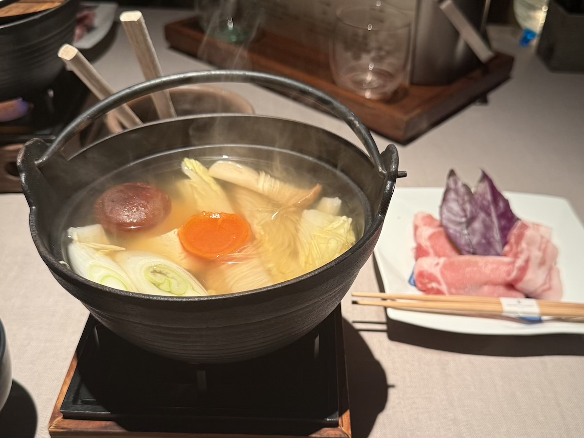 チェックインの日のディナーは、朝食会場と同じ、ホテル内にあるダイニング「グスク」に伺いました。この日いただいたメニューは、「沖縄県産特選しゃぶしゃぶ“グスク”」。