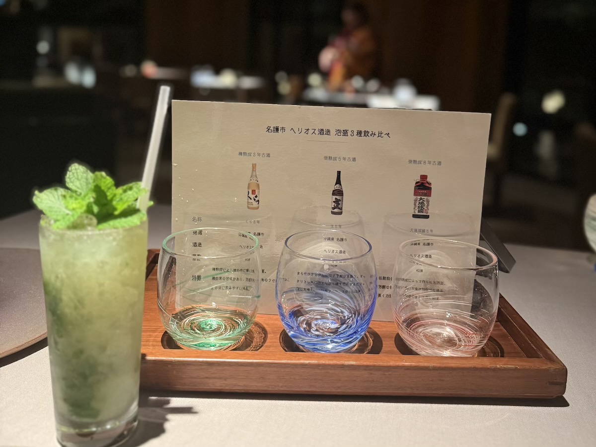 そして、印象深かったのが、泡盛の飲み比べ。名護市「ヘリオス酒造」さんからの3種をグラスで少しずつ。琉球グラスに注がれた泡盛の味わいは、とっても強かったですが、どこか土と風の香りがして。三線の音色を聴きながら味わう、沖縄料理。ここでしか味わえない豊かな体験をさせていただきました。