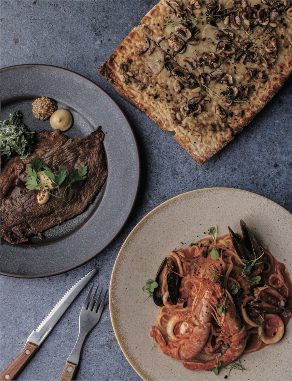 また「LATTE GRAPHIC」の魅力は、朝だけではありません。ランチタイムには、彩り豊かなボウルメニューやパスタ、ランチコースなどが揃い、夜にはアンガス牛のステーキやラムバーグ、そしてディナーコース(要予約)など、カフェの域を超えたディナーが楽しめます。オセアニアを中心にセレクトされたワインやカクテルも豊富で、アペロタイムにも良さそうです。1日のうちにどの時間にきても、ちょうどいい食事とドリンクがあるなんて……本当にうれしい限り!