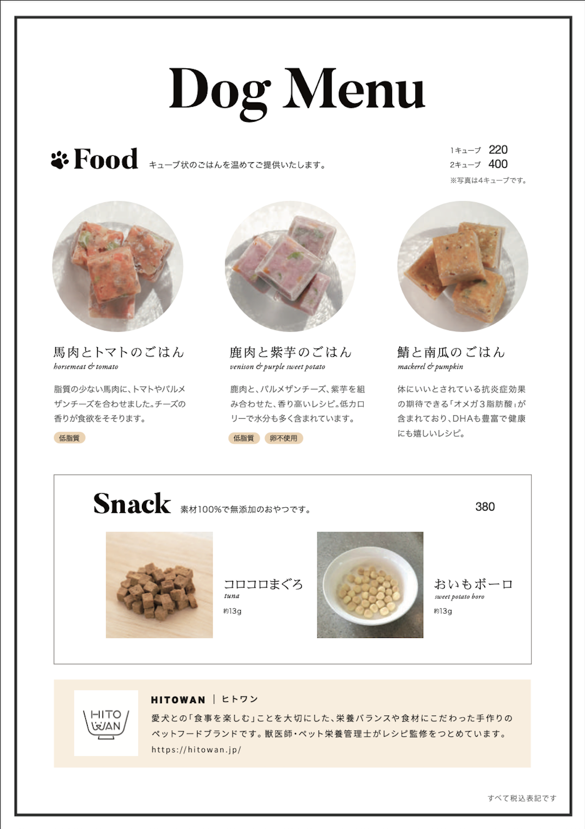 しかも、テラス席はペット同伴OK。しかもしかも、ドッグメニューまであるという充実ぶり!! メニューを見てみると、素材にも製法にもこだわったHITOWAN監修のフードがずらり。馬肉とトマトのごはん、鹿肉と紫芋のごはん、鯖と南瓜のごはんなど、どれも無添加で栄養バランスも考えられています。