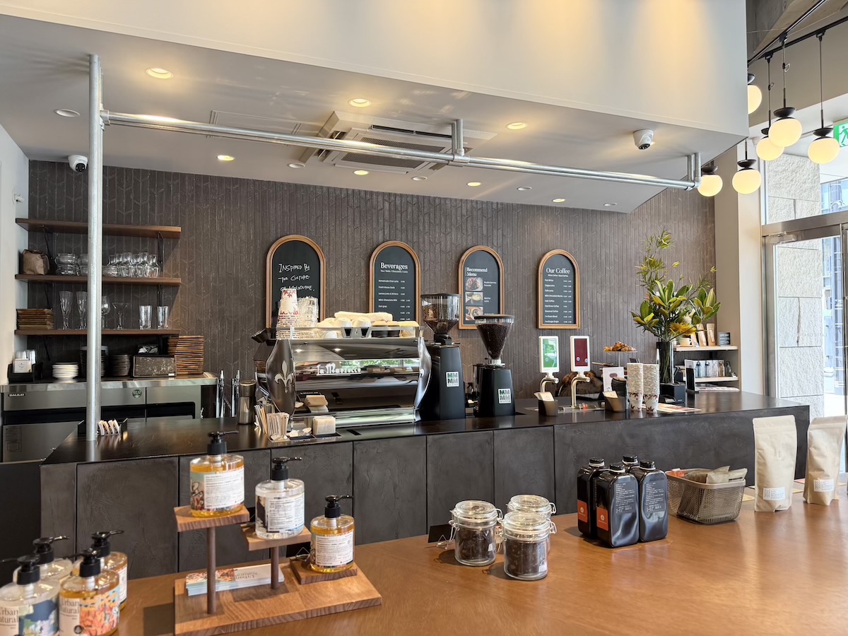 「LATTE GRAPHIC」に一歩足を踏み入れた瞬間、漂うのはまるで海外のカフェに来たかのような雰囲気! 天井まで届くガラスからは、たっぷりの自然光。カウンターの奥には、存在感のあるエスプレッソマシンやコーヒー豆の瓶が並び、シンプルで洗練されたインテリアの中に、どこか温かみのあるアットホームな佇まいです。